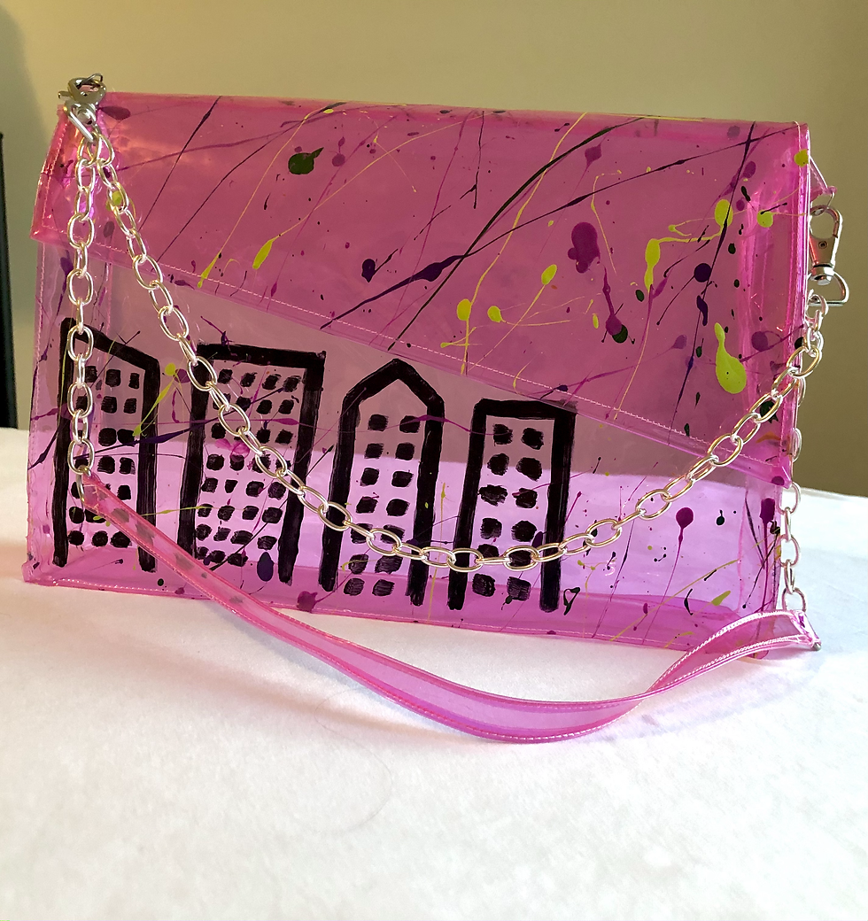 Purse with removable chain straps to make it a shoulder, handheld, or clutch bag. Features one of a kind splatter paint and building design and clear plastic snap closure.