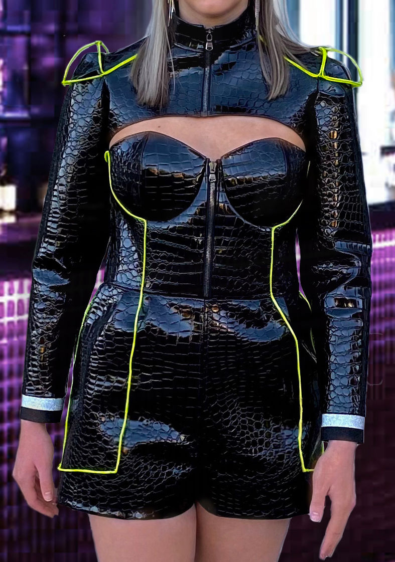 Fully lined strapless romper with pockets, and an Ultra cropped jacket with sparkly elastic cuffs. Accented with matching zippers and lime green neon wires with clip on battery packs. 4 AA batteries not included.