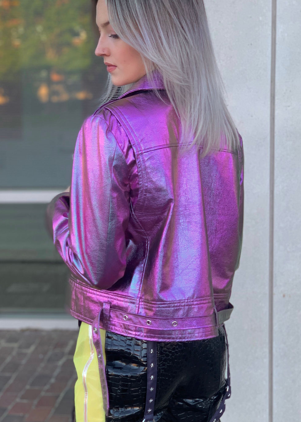 Fully Lined Jacket with pockets, sleeve zippers, and removable belt. Features purse holder shoulder strap with star button detail.